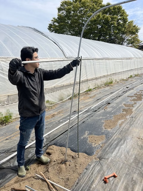 ハウス内では夏作に向けて苗の育苗が本格化しました。外の圃場ではトマト、茄子、ピーマンなどの果菜類を中心に植え、ハウス内では葉物野菜を中心に無農薬で育てていきます。